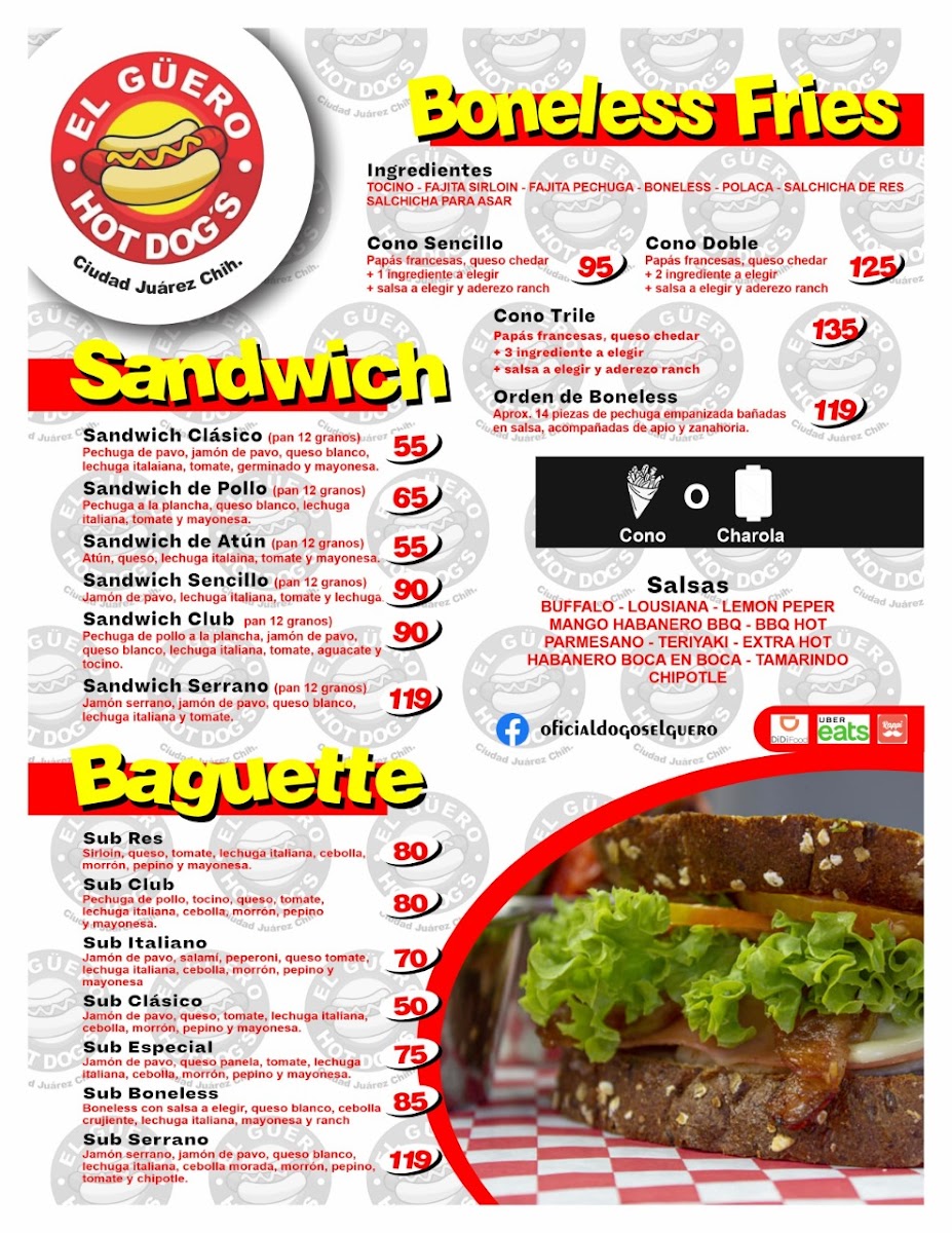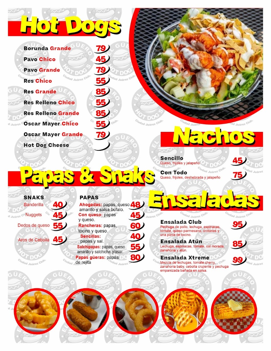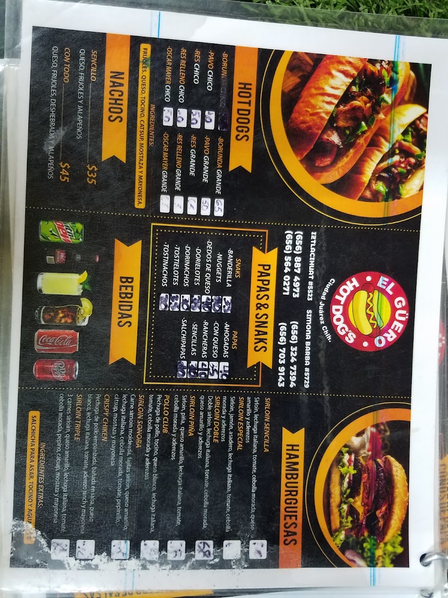 From a reviewer's perspective, the menu at Hot Dogs El Güero on Iztaccihuatl offers a lively and indulgent variety that caters to both casual diners and hearty appetites. The potato selections, including Papas Ahogadas, Papas Con Queso Fundido, Papas Sencillas, and Papas Rancheras, provide flavorful sides or standalone treats. For those craving fried delights, the Charola Boneless and Charola Boneless Doble are generous servings of crispy boneless chicken, while the Snack's section, featuring Nuggets, Banderillas, and Dedos De Queso, adds playful finger-food options. Sandwich lovers are well-covered with choices like Sándwich De Pollo, Sándwich Clásico, Sándwich Club, Sándwich De Atún, and Sándwich Sencillo, all balancing variety and comfort. Breakfast enthusiasts can enjoy combinations such as Combo 3, Combo 4, Combo 5, Combo 6, and Combo 7, ensuring a filling start to the day. The nacho offerings-Nachos Con Todo and Nachos Sencillos-stand out for generous toppings and satisfying crunch. Burger options, including Hamburguesa Sirloin Piña, Hamburguesa Sirloin Pollo Club, and Hamburguesa Sirloin Sencilla, pair perfectly with Papas Fritas or Papas Con Queso, delivering classic indulgence. Of course, the hot dogs themselves are the star, ranging from Hot Dog Pavo Chico and Hot Dog Pavo Grande to Hot Dog Res Chico, Hot Dog Res Grande, and Hot Dog Res Relleno Chico and Grande, offering hearty, flavorful variations that keep the menu exciting. Overall, the menu strikes a balance between comfort food staples and inventive twists, making Hot Dogs El Güero a go-to spot for a casual yet satisfying meal in Juárez.